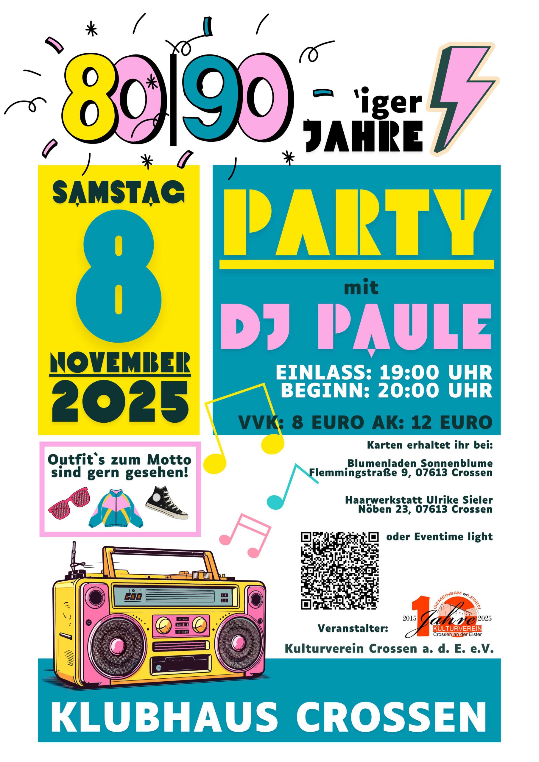 « Alle Veranstaltungen 80|90er Jahre Party mit DJ Paule auf dem Saal 8.11. 20:00 « KULTURDIENSTAG, „Mit dem Motorrad durch Bhutan & Sikkim – zwei verborgene Juwelen im Himalaya“ Muldtimedia-Vortrag mit und von Jürgen Koch KULTURDIENSTAG Multivisionsshow „Mit dem Geländewagen quer durch den Iran“ mit und von Bernd Landmann. » 80|90er Jahre Party mit DJ Paule auf dem Saal Veranstalter ist der Kulturverein Crossen e.V. + Google Kalender+ Zu iCalendar hinzufügen Details Datum: 8.11. Zeit: 20:00 Veranstaltungskategorien: Tanz- und Unterhaltung, Tanzveranstaltung Veranstalter Kulturverein Crossen e.V. Webseite: https://kulturverein.crossen.de/ Veranstaltungsort Klubaus Crossen Saal hauptstraße 12 07613 Crossen, Google Karte anzeigen