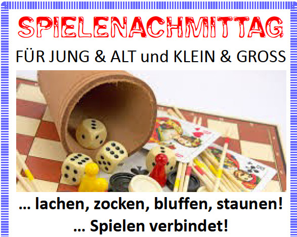 … lachen, zocken, bluffen, staunen! … Spielen verbindet! Freuen Sie sich auf einen gemütlichen Nachmittag, bei Kaffee, Gebäck und Kaltgetränken. Es können gerne auch eigene Spiele mitgebracht werden!