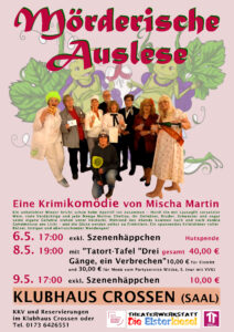 Fr., 08.05., 19:00 „Mörderische Auslese“ mit „Die Elsterkiesel“ – dieser Abend wird begleitet von einem dreigängigen Menü, welches von einem externen Catering Betrieb „Partyservice Wittke“serviert. Eintritt Theater: 10,00 €, Menü: 30 € („Partyservice Wittke“) – Nur mit KVV.