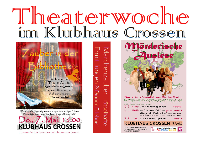 … ab 06.05. Theaterwoche Crossen – Märchenzauber, rätselhafte Ermittlungen & Dinner-Erlebnis! Mit dabei die Kinder-Theater-AG der Grundschule und „Die Elsterkiesel“ mit ihrem neuen Krimispektakel „Mörderische Auslese“, ein Krimidinner von Mischa Martini.